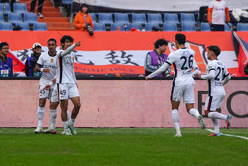 10月26日,上海海港队球员李新翔(左二)在进球后与队友庆祝。 新华社记者 朱峥 摄
